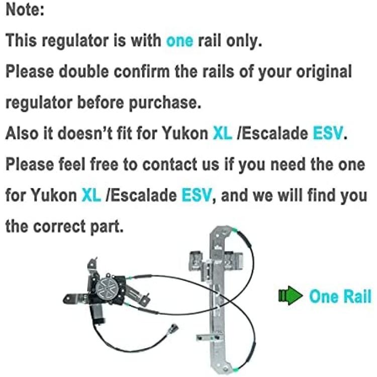 Tahoe 2000-2006 Sport UtilityYukon 2000-2006 Sport UtilityEscalade 2002-2006 Sport Utility Please confirm the vehicles model, year, body style as well as the connector when you purchase!  Each window regulator is for specific application!