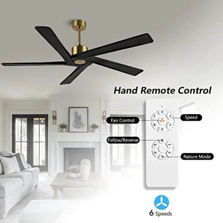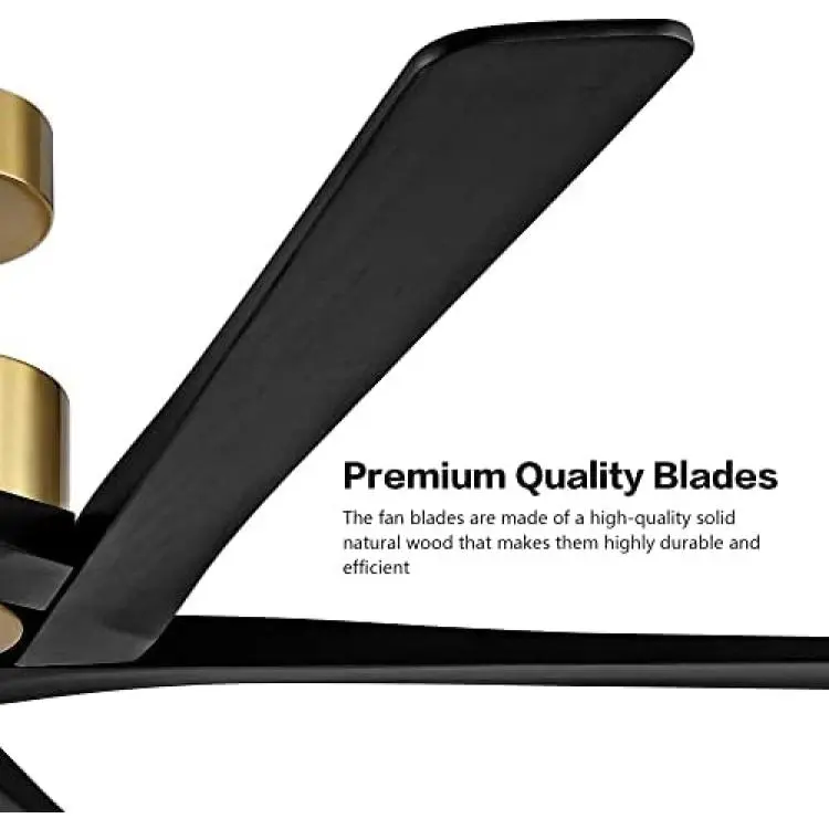 WINGBO 64 Inch DC Ceiling Fan without Lights, 5 Reversible Carved Solid Wood Blades, 6-Speed Noiseless DC Motor, Ceiling Fan No Light with Remote, Brass Finish with Black Blades, ETL Listed