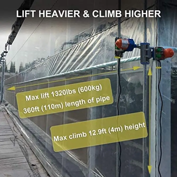 1* Joint Box (transformer+Controller)2* Roll Up Motors1*Roll bar adaptor1*Telescope bar adaptor5*Screws of M8x251*Bolt of M6x551*Nut of M6 Suggest ID 3/4" NPS roll tube and telescope tube Roll Tube Size: 5ft~360ftPower: 100 wattAdjust Roll: 40 limitsVoltage: DC 24vSpeed: 2.8 rpmRated Current: 3.6ATorque: 100 N.mProtection Class: IP66 Max roll tube length: 360ft(110m)  Climb 10ft height when ID 1/2" NPS roll bar tube  Climb 12.9ft height when ID 3/4" NPS roll bar tube  Max lift 1320lbs (600kg) The original bronze color adapter fits for ID 3/4" NPS(DN20mm) galvanized tubing, roll bar travel is 12.9ft.Insert the blue shaft washer helps to fit for ID 1/2" NPS(DN15mm) galvanized tubing, roll bar travel is 10ft.Fits for OD 1" galvanized tubing (or ID 3/4" NPS).Needs to telescope another suitable size of tubing, so the rotation bar has a enough length to make roll up bar tightly slide along the roof flame.Press the knob and rotate it for setting limits, its invalid without press down.The waterproof lid to keep upper water resistance, please close it after setting up the limit switches.Knob: FusesSwith1: ON/OFFSwith2: Open/Stop/Close Window Switch Style: Maintained (switch the toggles, the motors will keep running until the limit is reached.)  Input: AC 110VOutput: DC 24VPlug wire (input) length: 4.75ftBare wire (output) length: 1.6ftJoint box: Transformer + controlSize: 9 x 6 x 3.8 inches 1.The motor with limit switch would stop once hitting the limit.  2.Two 10A fuses for two channel of outputs.  3.Please install it inside the house.  4.The product is without timer, its main for transforming the voltage and controlling the motors. IP66 waterproof protection class.Compact size and low noise, easy installation.Roll up tube length from 5~360ft, climb 10ft height when ID 1/2" NPS roll tube, climb 12.9ft height when ID 3/4" NPS roll tube.Setting the limit switches on hoop house roll up ventilation motors, roll up motor and climber work perfectly togetherAfter the installation of the roll up motor, be sure to cover the waterproof cover to prevent water.Its suggested to use 16 AWG wires for motors if the wire is within 165ft (50m), the extension wire is not included.