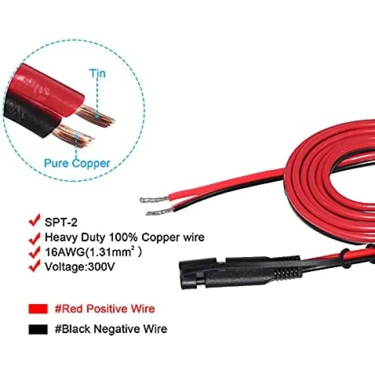 *SAE extension cable single head plug: 12 Feet long copper wire, SPT-2 16AWG,2 Pin, red wire is for positive and black wire for negative, fits most battery chargers with SAE quick release connectors, Tinned ends is easy to connect and weld.