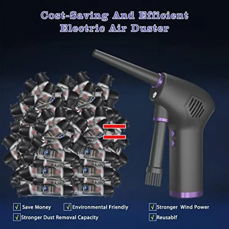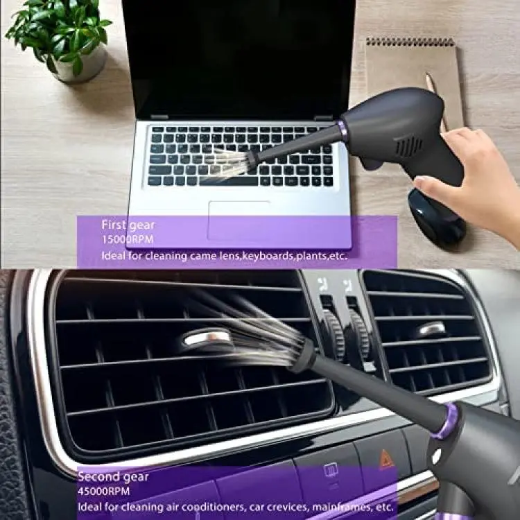 Large capacity battery?15000 mAh large capacity battery?longer battery life and stronger powerSSuper motor?450000 RPM of 60W super brushless motor, less wear and tear, more blowing powerLLong working hours?40-60 minGear speed: Two levels of adjustment to cope with different dust, suitable for cleaning keyboards, computer hosts, camera lenses, air conditioners, etc.