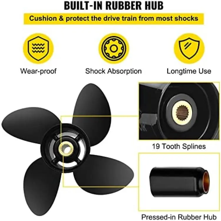 *Complete Hub Kits: The outboard motor propeller comes with complete hub kits- a rubber hub and 13 tooth splines. The wear-proof hub also has a strong damping effect, designed for cushioning and protecting the drive train from most shocks.