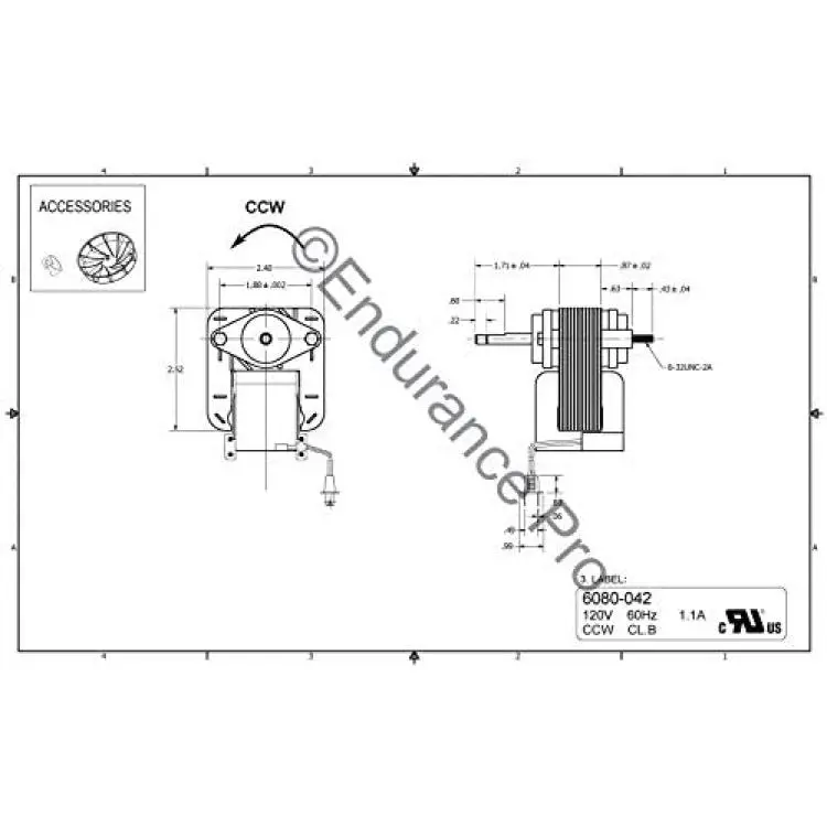9 amps, 120V 60Hz. 4 5/8 inch x 1 1/8 inch Fan blade rotation CCWSE; shaft 3/16 inch x 1.5 inch with..
