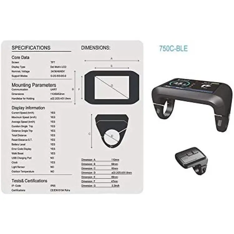 500C/P850C/860C/DPC18 can work with the Bafang BBS01, BBS02 & BBSHD mid drive/Front/Hub motor,But 750C-ble can only suit BAFANG mid motors, not suit hub/front motor. The display is 5 Pin female, yours must be 5 pin male. Please help to make sure about this.If your Bafang motor is front or hub motor, you need to make sure about your controller is Bafang agreement. If you are still not sure, it is better to send the seller picture to confirm it.The 750C bluetooth function display can only work with the iPhone cellphone.Only Compatible with Bafang Motor BBS01, BBS02 BBS03 and BBSHD.IP-Code IP65 Certifications CE/EN15194 Rohs500c does not have the charger port.1. Suitable for low temperature?Max -20?.2. High-contrast 3.2inch IPS colorful matrix screen.3. Ergonomic external button design, easy to operate.4. Speed display: AVG SPEED, MAX SPEED, SPEED (Real-time).5. Kilometer / Mile: Can be set according to customers’ habits.6. Smart battery indicator: Provide a reliable battery indicator.7. Mileage indicator : Odometer/Trip distance/Riding time.8. Power indicator: real time power indicator, digital or analog.9. Speed limit value indicator. 10.Error code indicator. 11.Software upgraded: Software can be upgraded through UART.