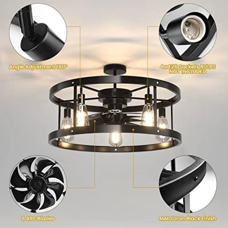 CASENKE Ceiling Fan with Lights Remote Control, Black Industrial Ceiling Fan Low Profile for Bedroom Kitchen Living Room 5 × E26 Base (No Bulbs Included)