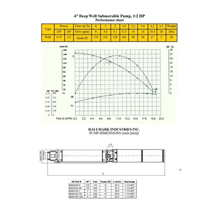 Hallmark Industries MA0343X-4A Deep Well Submersible Pump, 1/2 hp, 220V, 60 Hz, 25 GPM, 150' Head, Stainless Steel, 4"