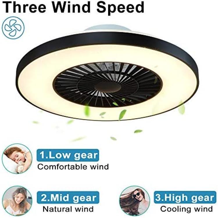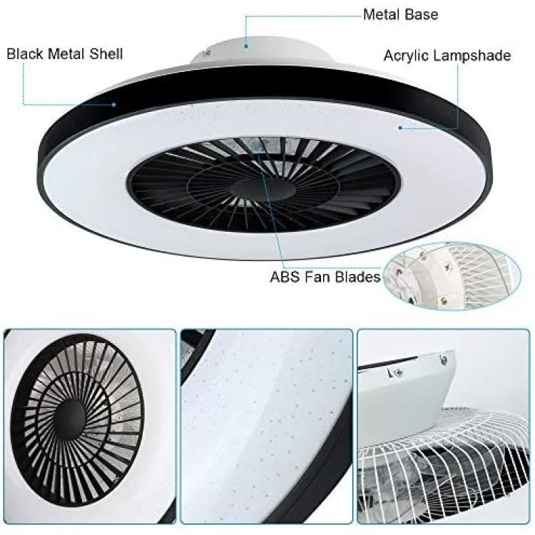 The stars lamp shape of our bladeless ceiling fan adopts high transparent acrylic design, which is not only hard, high temperature, soft and uniform, but also makes you feel like living in the sky and gives you high-quality sleep quality when you turn on the lamp.Turn on the night light by remote control. If adults or children are afraid of darkness, it can bring you a sense of security. It is the good choice for your thin embedded ceiling fan.The bunk bed small enclosed ceiling fan combines the advantages of low clearance ceiling fan with remote control and ceiling lamp. While saving space, you can get a comfortable experience.Safety & Extensive UseAir Flow PromotionSilent Motor3 Color Temperatures: 3000K/4500K/6500K3 Fan Speeds: Low/ Medium/ High GearBrightness: Adjustable(100%Max)Timing Setting: 1H/2H/4HOther Mode: Night Light Motor: Denoise Item Dimensions: 24.8 x 10.6 x 24.8 inches (LxWxH) Voltage: 120 Volts Batteries Included?No Color: Black-White Material: Plastic & Acrylic Power Source: ?Corded Electric Lumen: 2200 LED Chips: 216
