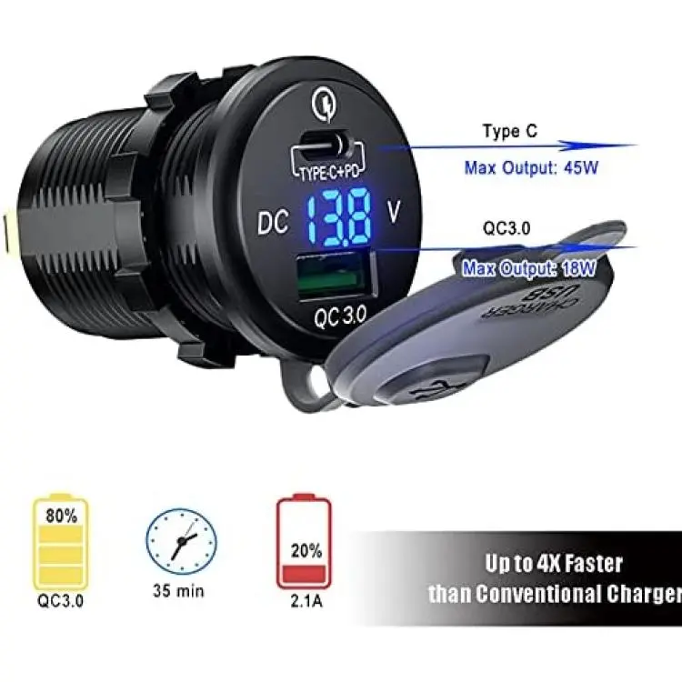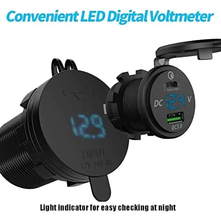 Comes with Type C and QC3.0 usb car portit can be installed in any position: vertical, horizontal or under the dashboard, or any desired flat surface, etc.Suitable universally for most DC 12-24V vehicles, cars, SUVs, motorcycles, motorcycles, bicycles, boats, marinas, etc.Suitable for all popular USB devices, such as Samsung Galaxy S8 / S7 Edge / S7 / S6 Edge / S6 / Nexus 6 / LG G4 / Huawei P9 / LG G5 / HTC 10 / ZTE Axon 7 etc.Input current: ?10AThe total watt output at 12 volt input: PD 30W/ QC3.0 15WFor vehicles, its recommended to get power from the fuse box, while for the motorcycle, better connect to the wires of the key switch.The led voltage meter reading will show up after the item is connected to the battery.For best charging speed, use your original fast charging cable or a third-party certified cable (eg MFI).Some mobile phones do not support fast charging, such as the iPhone series. It will adapt for normal charging speed automatically.Width: 2.87cmHeight: 4.17cmWeight: 35g