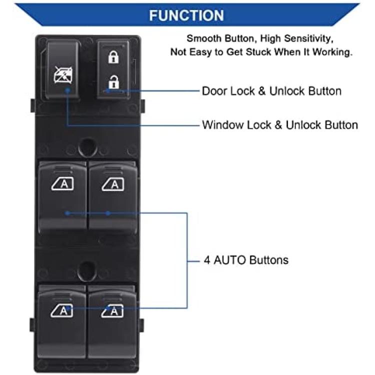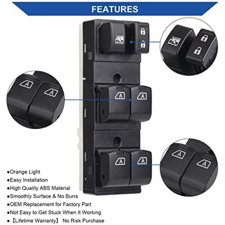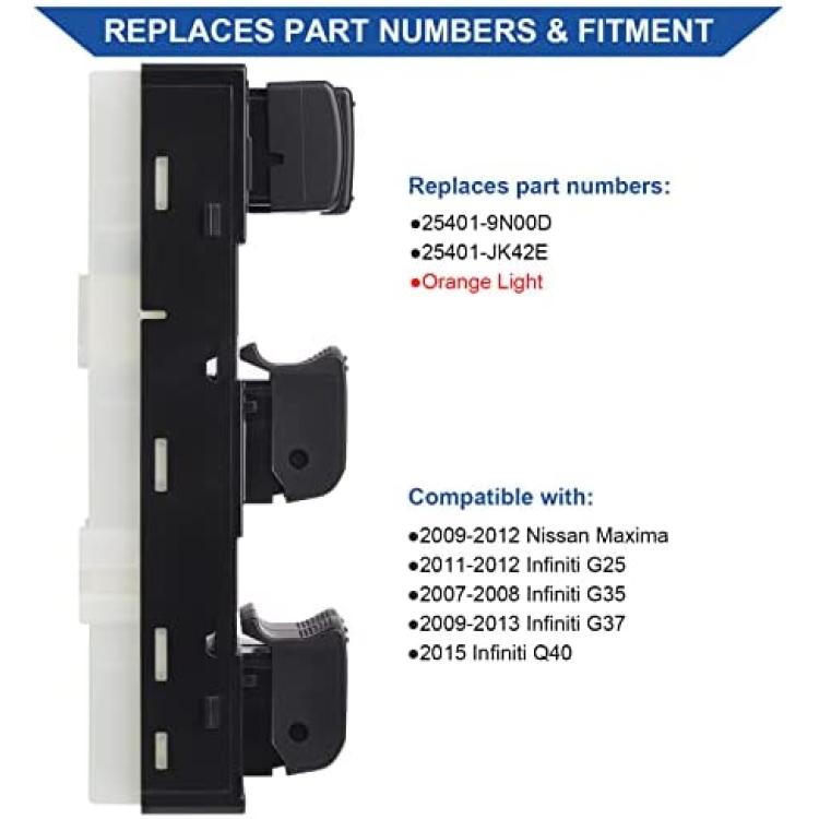 Nissan Maxima 2009 2010 2011 2012Infiniti G35 2007 2008Infiniti G37 2009 2010 2011 2012 2013Infiniti G25 2011 2012Infiniti Q40 201525401-9N00D25401-JK42EMaterial: ABS plasticButtons: 6Feature?4 "A"Pins: 3 + 10 pins terminal connectorFitment Type: Directly plug and play stylePackage Content: 1 x power window switch + 1 x removal barPosition: front left driver sideBacklight: OrangePress the left-front switch on the drivers window controller all the way downwards and maintain for 5-8 seconds.Please turn the switch all the way upwards and maintain for 5-8 seconds. Then restart the vehicle to complete the match.Plug in a new switch under full stop condition.Clean the dust off the plug and the connector before installing a new switch.Following the requirements to make sure window switches are fully functional. Otherwise, the window may have problems moving up and down. The up & down motor drive might even become damaged.Do NOT spill water on the car door because any water seeping in can lead to internal short circuiting.Do NOT put anything in the car window gap. Doing so may cause the window to become stuck, and unable to be lifted up or down. Moreover, the pressure will be transmitted to, and damage the lift motor.