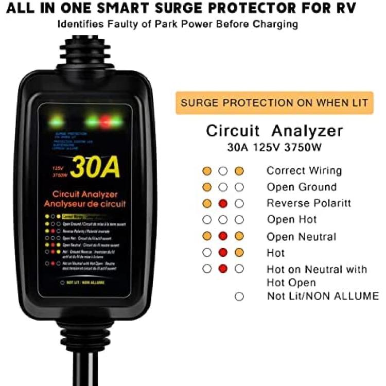rv Surge Protector 30 Amp Smart RV Surge Protector with Waterproof Cover All-in-1 Circuit Analyzer Power Guard for RV, Camper, Trailer, Truck, Motorboat, Yacht, Mobilhome