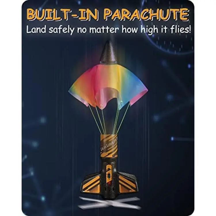 *SAFE LANDING: With built-in design, the parachute will automatically deploy when the rocket flies to the highest point. Once it is loaded back into the rocket, the self-launching rocket can be sent out again.