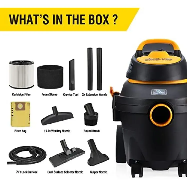 *INCLUDED ACCESSORIES: 7‘ x 1-1/4" Secure Fit Hose, (2) Extension Wands, (1) Dual Surface Selector Nozzle, (1) 10 In Wet/Dry Nozzle, (1) Gulper Nozzle,(1) Crevice Tool, (1) Round Brush, (1) Tool Storage Basket, (1) Cartridge Filter, (1) Filter Bag and (1) Foam Sleeve