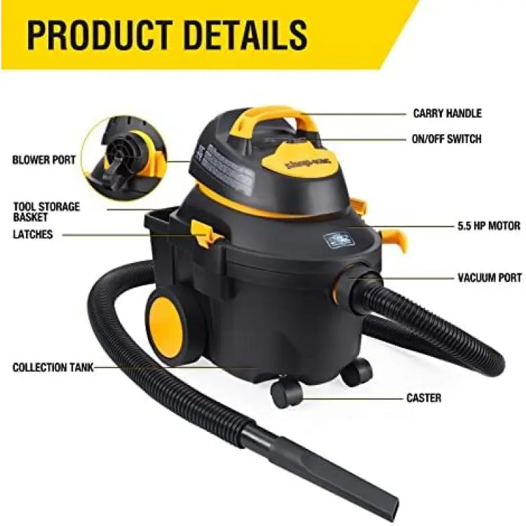 *3 IN 1 MULTI-FUNCTION: Peak 5.5 HP, strong dry/wet suction and blowing function. Its used to clean dust, wood chips, debris or damp sewage. This vacuum can also be used as a powerful blower, easily converted to a powerful air blower, which can blow dirt out of those hard to reach places or grass clippings from your sidewalk.