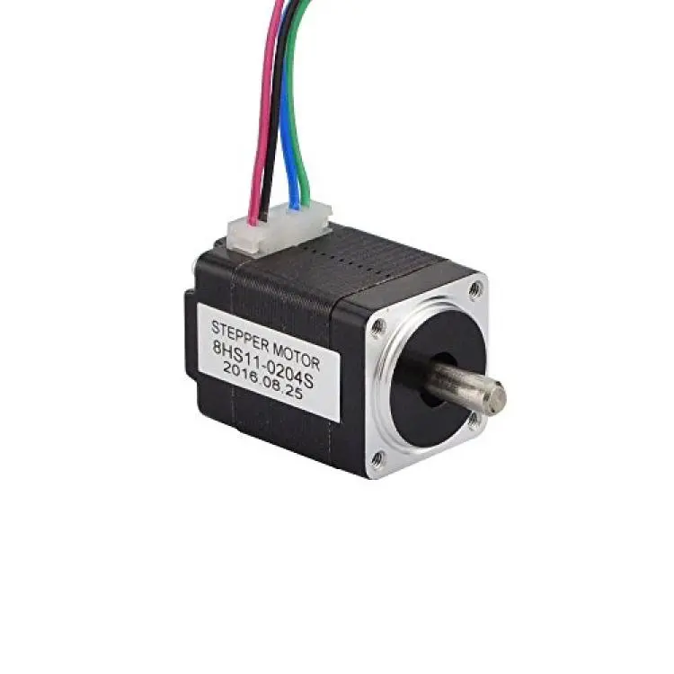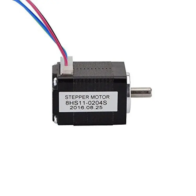 This hybrid bipolar stepper motor is the miniature stepper motor we carry, it with 1.8 deg. step angle (200 steps/revolution). Each phase draws 200 mA at 4.8 V, allowing for a holding torque of 1.6Ncm(2.3oz.in). Electrical Specification: * Manufacturer Part Number: 8HS11-0204S * Motor Type: Bipolar Stepper * Step Angle: 1.8 deg. * Holding Torque: 1.6Ncm(2.3oz.in) * Rated Current/phase: 0.2A * Phase Resistance: 24ohms * Inductance: 8mH+/-20%(1KHz) Physical Specification: * Frame Size: 20 x 20mm * Body Length: 28mm * Shaft Diameter: 4mm * Shaft Length: 10mm * D-cut Length: 7mm * Number of Leads: 4 * Lead Length: 300mm * Weight: 60g Connection: Black(A+), Green(A-), Red(B+), Blue(B-) Warning: Make sure the motor connect to a constant current or chopper drive controller before you test motor. Connecting the motor directly to a power supply will destroy the motor.