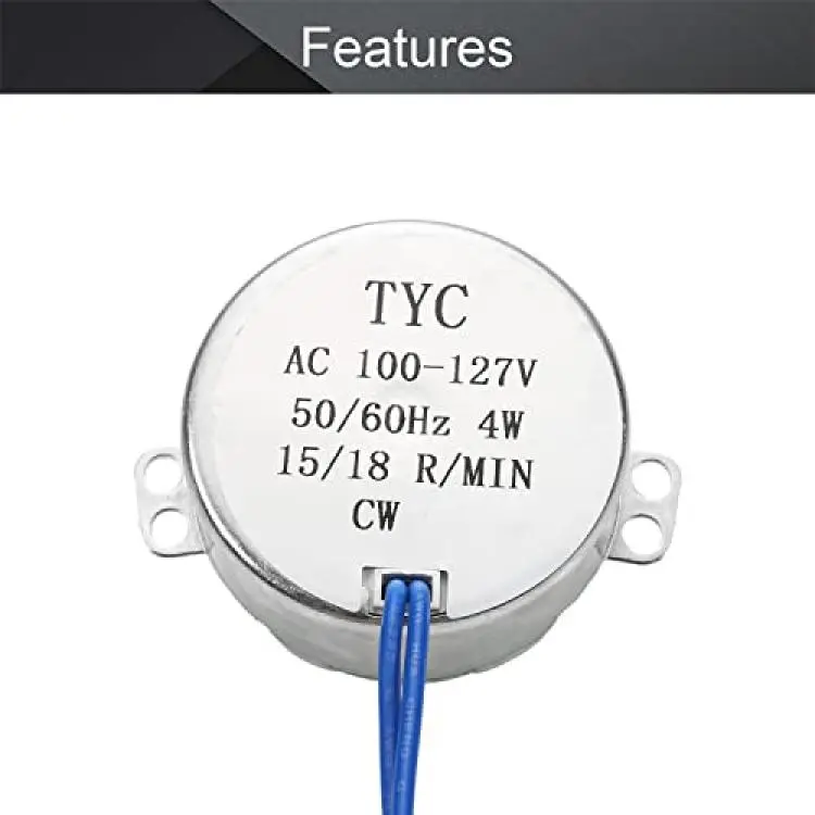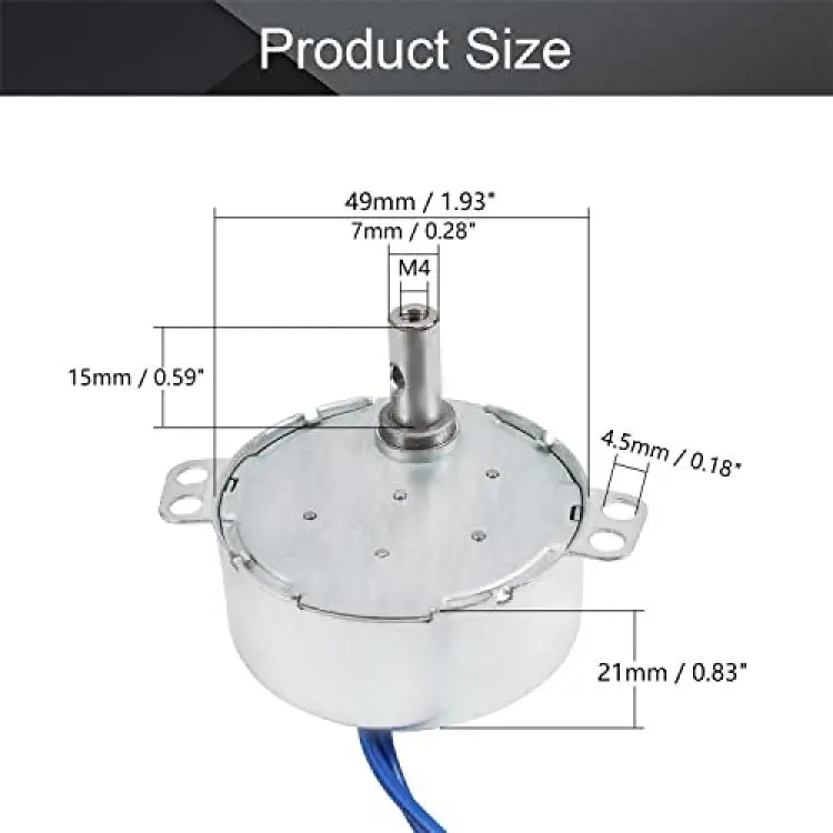 *【Parameters】 - Voltage:AC110V; Speed:15-18RPM; Power:4W; Direction:CW; Diameter:49.8mm/1.96"; Thickness:20.5mm/0.81"; Wire length:400mm/15.75"; Shaft diameter:7mm/0.28"; Shaft length:15mm/0.59"