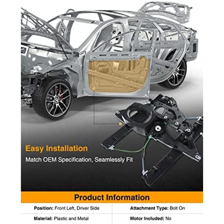 Power/Manual: Electric Power Window RegulatorAttachment Type: Bolt OnMaterial: Plastic and MetalDesign: Two Sliding BarsMotor Included: NoReference OE Number:  740-178, 6L1Z7823209AAPosition:  Front Left ( Driver Side )Quantity Sold: One PieceQualified facilities and advanced testing equipments, plus 100% quality inspection.Strong packaging to avoid any damages during the transportation.A-Premium will only ship you premium window regulators.A-PREMIUM team will get back to you in 24 hours if any questions.Excellent after-sale service will meet your requirements. Your satisfaction is our top consideration.